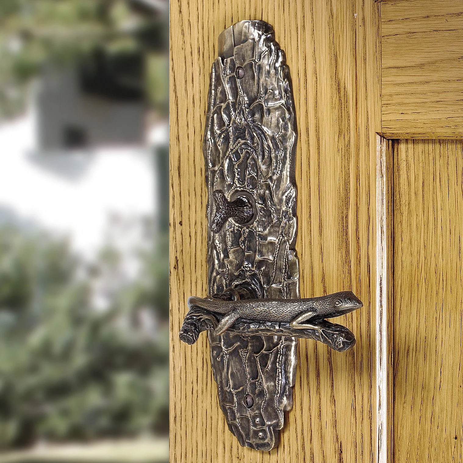 From wrapping to fusion, in the Hedgerow lever it is not clear at what point the stylized tree canopy became an upward-curving lever, and arguably it never did. Each organic design has its own tie to nature, and in the Lizard lever a gnarly twig branch is literally the lever support for a suspended anole lizard.