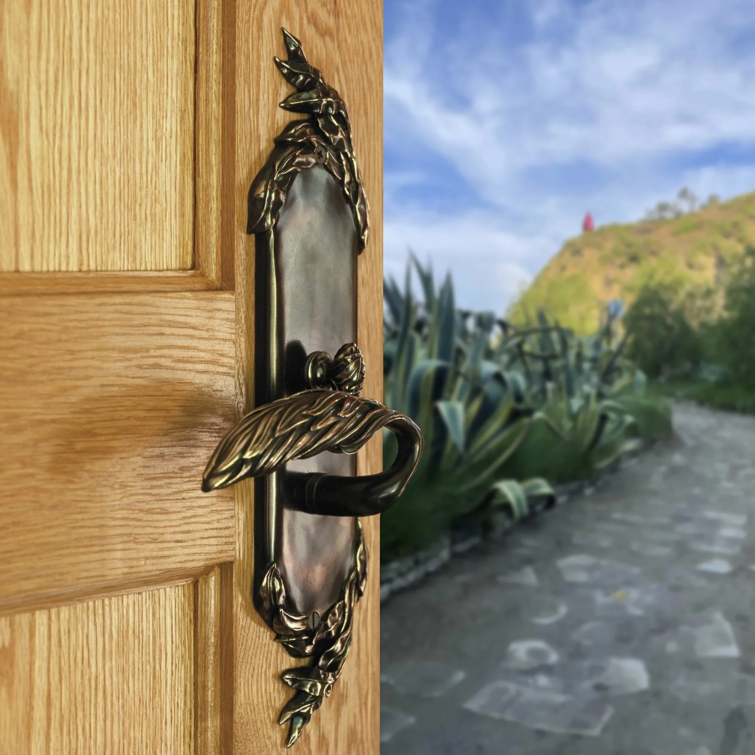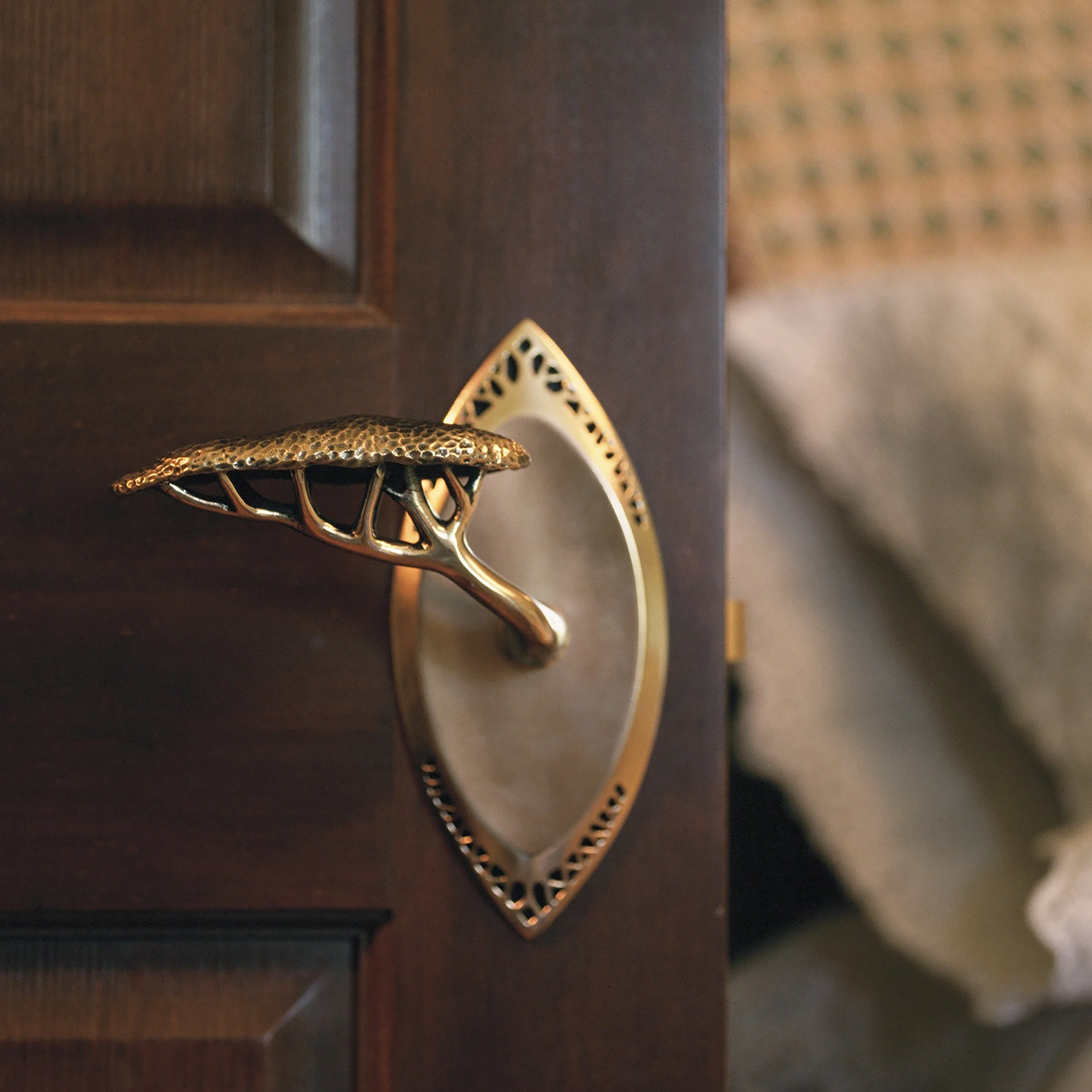 The Willow leaf has been used as an artistic wrapping to soften the edges and add artistry to what would otherwise be merely a functional door backplate. Willow leaves are pulled together in a swirl to encapsulate a bronze doorknob and flow directionally as wind-swept tendrils to smother and bend an otherwise plain bronze door lever.